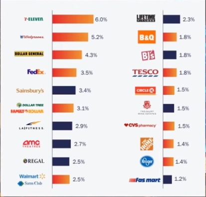 리얼티 인컴은 다양한 업종의 대형 우량 기업들과 계약을 맺고 있습니다. 대표 임차인은 다음과 같습니다.