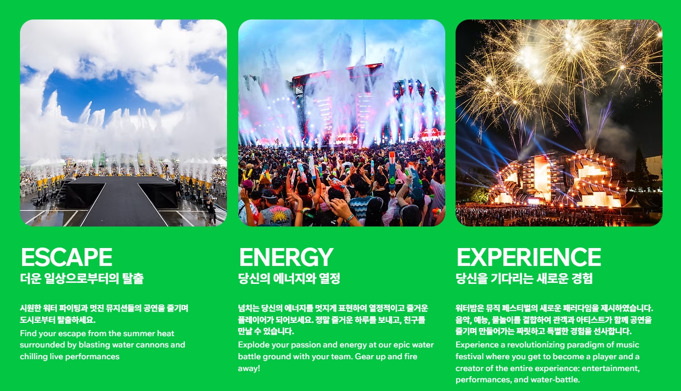 매년 여름 무더위를 날려주는 국내 최대의 워터 뮤직 페스티벌, 워터밤 서울은 댄스, 힙합, EDM, 그리고 강력한 물싸움으로 여름을 제대로 즐기고 싶은 사람들에게 최고의 이벤트로 손꼽히죠.