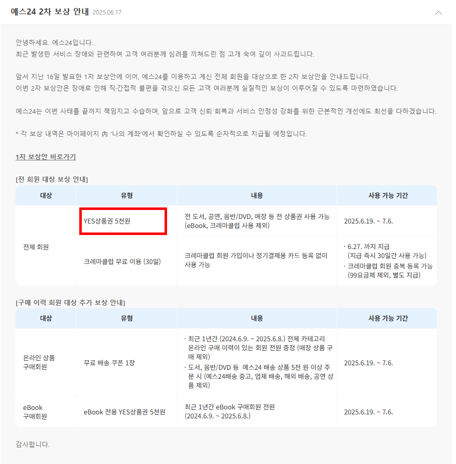 YES24는 피해 당일 기준으로 회원 가입이 완료된 모든 고객에게 YES상품권 5,000원권을 지급한다고 밝혔습니다.
